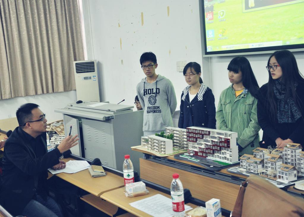 评图分为4组各25名同学进行,同学们分别展示设计图纸及模型,并在指定时间内对其方案进行阐述,向指导老师与专家评委表达其方案构思及特点;然后由专家评委对其方案做出提问或点评。答辩环节中,郑洲作为校外评委,与华南理工大学冯江老师一道对同学的设计进行了点评,并从设计实践的角度对25名学生的设计作品指出问题所在并给予指导。