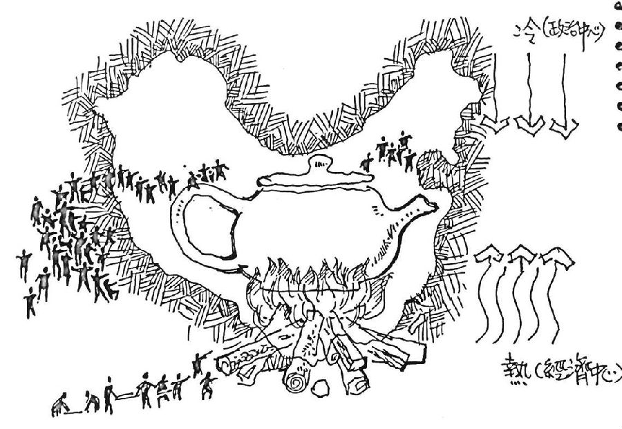 如果把中国地图比喻为一个茶壶,就是要把“壶把”端稳了在西面,要冒气在东边,而得风气之先的岭南地区在中国近现代的历史中一直是扮演着对外开放的先行者角色,差不多就是一个在茶壶底烧火的地方,自上而下的北面往往是加凉水的地方,深圳是壶底的一部分,是上世纪80年代在壶底添上的一把干柴。