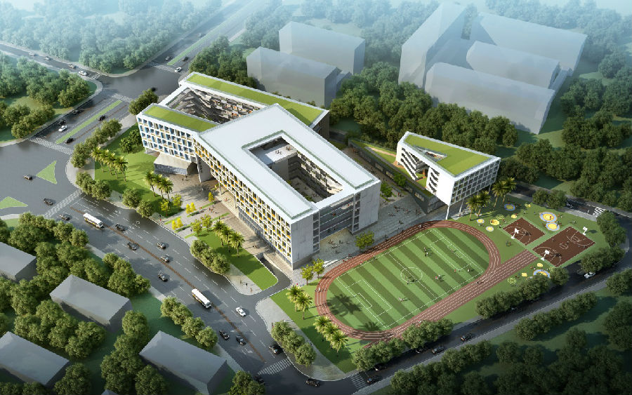 学校规划占地面积约为拟建19429.3m2 ,总建筑面积43300 m2,总规定建筑面积为29200 m2,其中教学及教学辅助用房约为20300m2,办公用房约为2500m2,生活服务用房约为6400m2,架空绿化休闲约为2400m2,地下车库及设备用房约为11700m2。建筑限高24米,建筑覆盖率45.1%,绿地率13%。