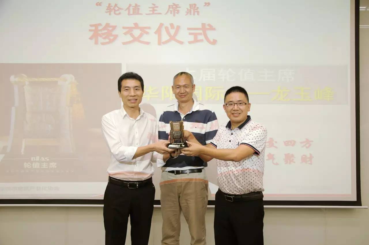 龙玉峰(左一)从协会会长陆荣秀(中)及上任轮值主席、深圳市鹏城建筑集团有限公司副总经理李世钟(右一)手中接过“轮值主席鼎”。