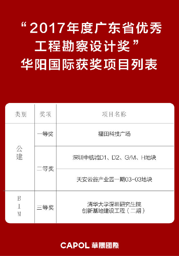 2017年度广东省优秀工程勘察设计奖评选结果近日公布。华阳国际共摘得1个一等奖、2个二等奖和1个三等奖。其中,福田科技广场荣获公共建筑类一等奖。