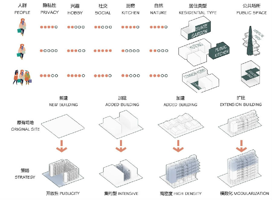 通过不同模块组织方式还原三种传统居住模式——合院生活、胡同生活、庭院生活,填补城市青年缺失的归属感。