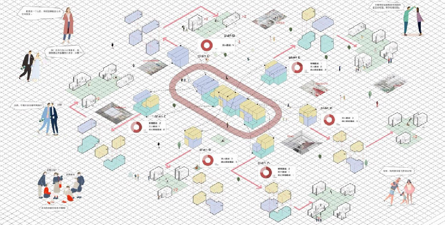 优化过程中,在保留原有理念基础上,小组成员考量实际地块特点,尝试全新规划,合理化配置居住模式,并让户型设置更加模块化。