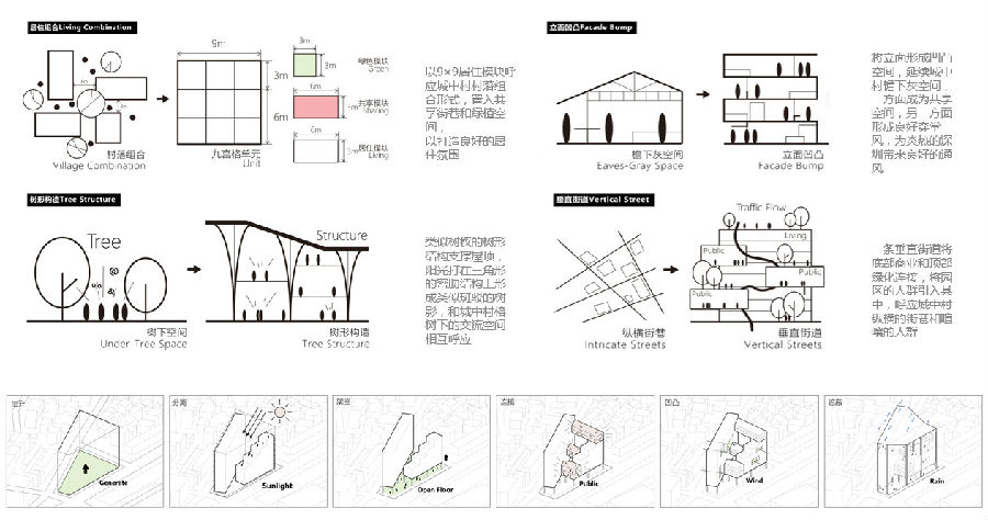 在精致城市面孔下,保留城中村原始空间尺度和生活方式,强化高层建筑优势,并通过尺度、模块以及公共空间的变化,丰富空间关系和属性,形成村中城概念。