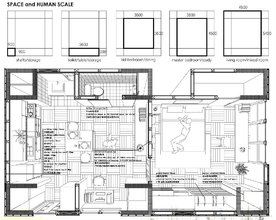 5.4mx5.4m户型模块中,结合复合轴网和空心结构柱,对应服务空间与被服务空间,最大化居住单元的灵活性,让使用者更积极参与“家”的营造。