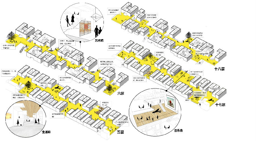 从戏剧理论中获取青年公寓的灵感,并在建筑设计中灵活改造。将古村落的隐含秩序提取,形成设计逻辑——青年人因兴趣形成集聚,相似互补,在多元空间里上演丰富多彩的生活。
