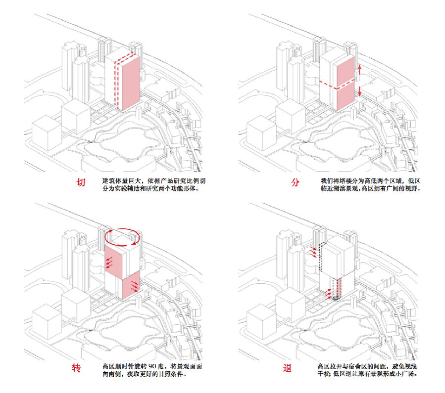 塔楼进一步高低分区,低区临宜人湖滨景观,高区90°旋转将景观面向南,以获得开阔视野,建筑整体形象也更为突出。