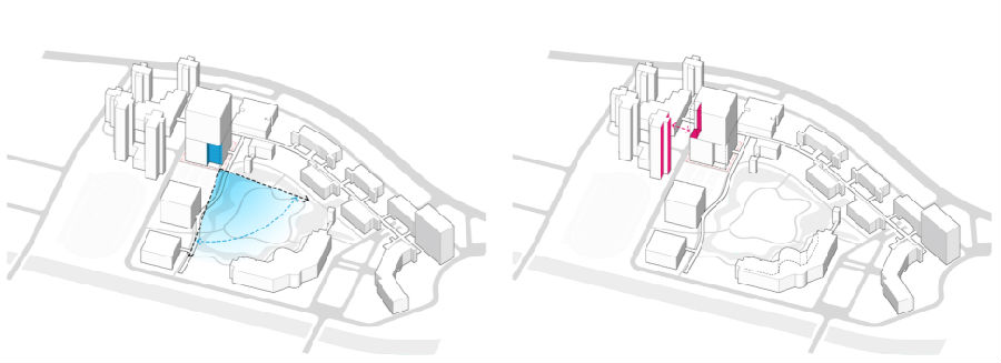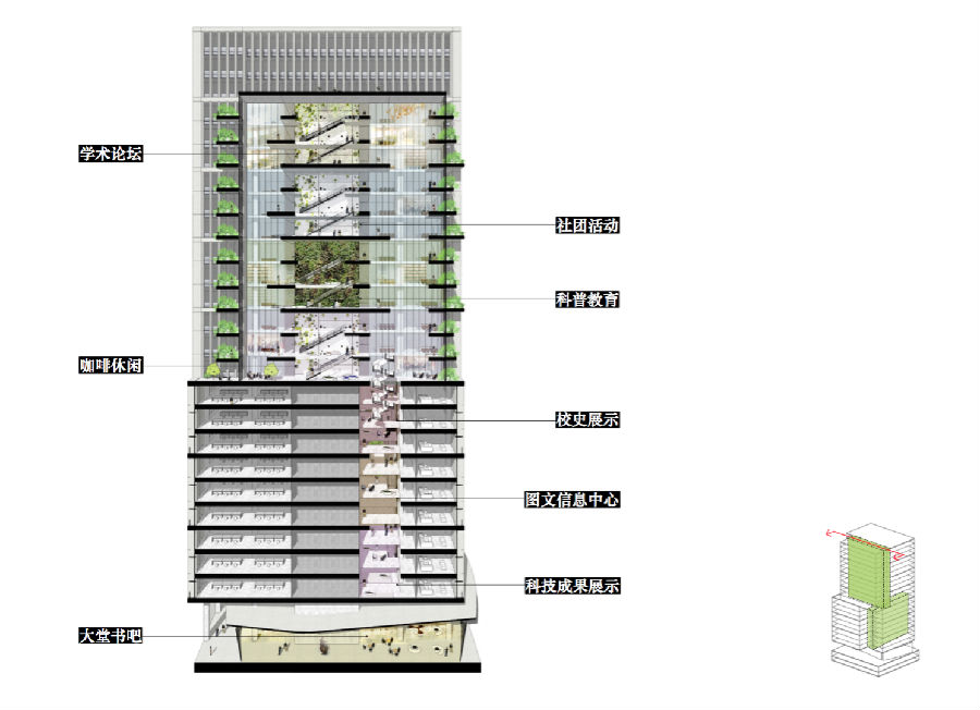 校内三大轴线、四大功能区在此交界,建筑设置底层架空,尽可能释放地面空间,满足大量人流穿越与休闲活动的需求。