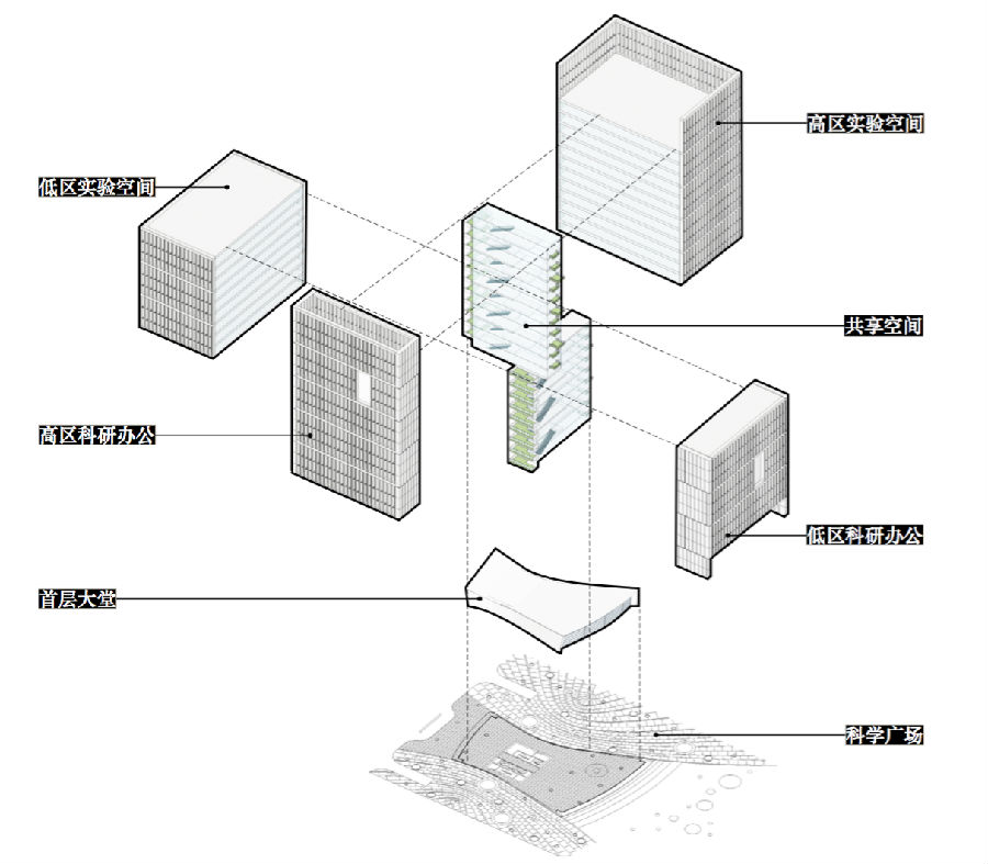 作为第三代实验室建筑产品,设计引入中部共享空间系统,贯穿起所有科研空间,每三层一单元被赋予不同主题,形成最具活力的社交场所。