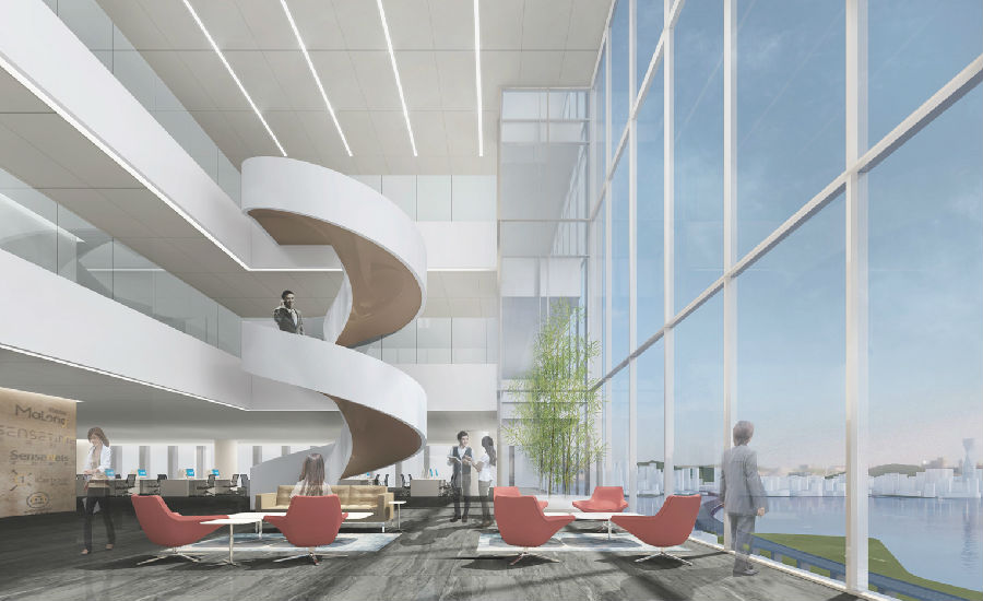 于此同时,多层次的叠苑组织,南北对流的通廊设计,改善了塔楼中部的微气候环境。叠苑不但提供空中绿植景观,也为使用者创造了效果极佳的观景机会。我们力图将中国人传统的二维庭院生活转化为三维立体社区。用设计克服技术难题,探讨未来办公空间发展的可能性。