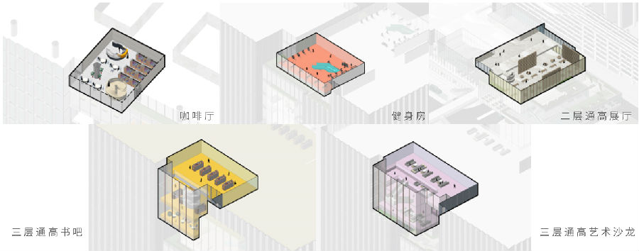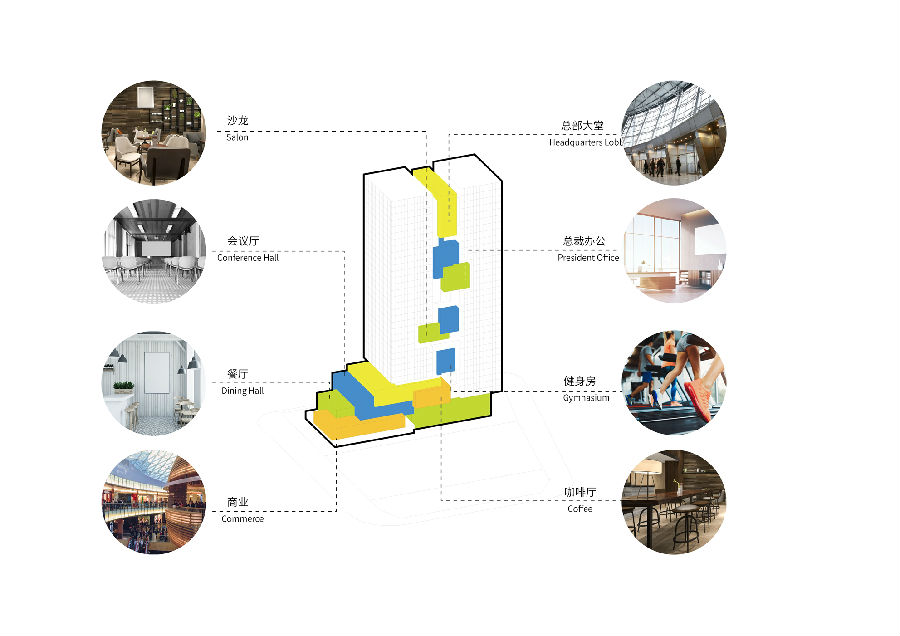 设计在功能布局上植入资源中心概念,将会议展览、产品发布、休闲健身、商业等具有公共性的资源中心功能,布置于塔楼中部BOX,丰富的空中活动场景将形成富有趣味的城市昭示面。而立面采用的LED发光媒体幕墙,也将在未来城市夜景中,成为动态可更换的展示窗口,提升建筑价值。