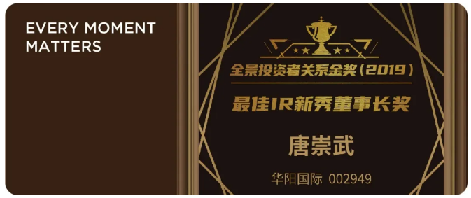 全景网联合南开大学中国公司治理研究院投资者关系管理研究中心,重磅推出“全景投资者关系金奖(2019)”,华阳国际董事长唐崇武荣获最佳IR新秀董事长奖。