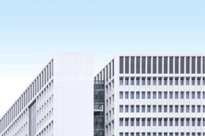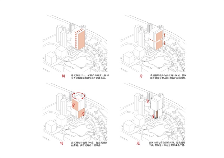 在产品研究的指引下,建筑切分为办公与实验两大功能形体,既不打破现有空间尺度,又合理划分平面功能。塔楼进一步高低分区,低区临宜人湖滨景观,高区90°旋转将景观面向南,以获得开阔视野。东南与西北角的两处退让设计,削弱了高层建筑带来的压迫感,让建筑更好融入校园。