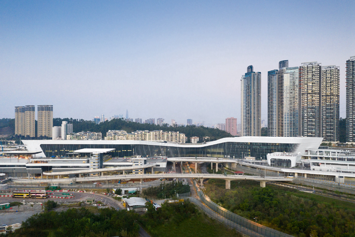 作为深圳首个采用“客、货一站式通关”及“人车直达措施”的口岸建筑,面临极大的交通压力。规划创造性地将货检区设置于一层,将旅检区设置于二层高架平台,从而实现旅检、货检在竖向上的分离。并通过对外部交通进行梳理和调整,以多个高架桥与人/车行桥连接周边环境,改善项目所处地段外部交通疏导能力。
