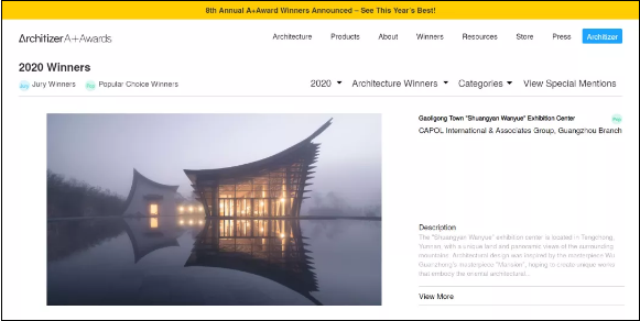 其全球评审团集聚400多位不同领域的领导者,包括知名建筑师、设计师、评论家、记者、房地产开发商等,评审侧重“形态”、“功能”与“创新”三个价值维度对项目进行评价,2020年为ArchitizerA+Awards的第8个年头。