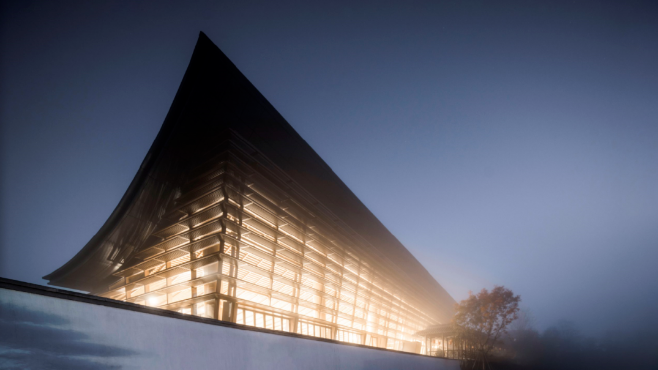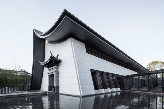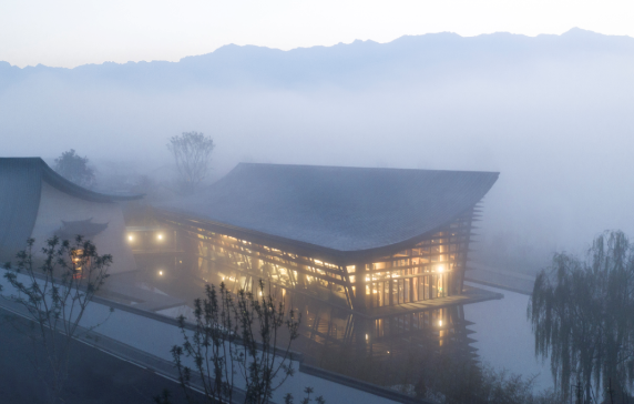 “双檐宛月”展示中心位于云南腾冲,用地得天独厚,尽览环山美景。建筑设计从艺术大师吴冠中的名作《大宅》中受到启发,希望创作出体现东方建筑意蕴、集腾冲山水之美的独特作品,正所谓“双檐宛月一水间,环山揽园入画中”。The "Shuangyan Wanyue" exhibition center is located in Tengchong, Yunnan, with a unique land and panoramic views of the surrounding mountains. Architectural design was inspired by the masterpiece Wu Guanzhong's masterpiece "Mansion", hoping to create unique works that embody the oriental architectural connotation and gather the beauty of Tengchong mountains and rivers, which is what is called "double eaves, moon and water, surrounded by mountains and gardens."