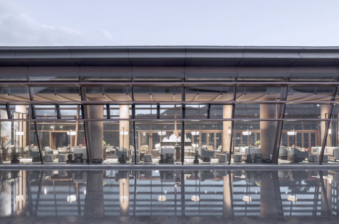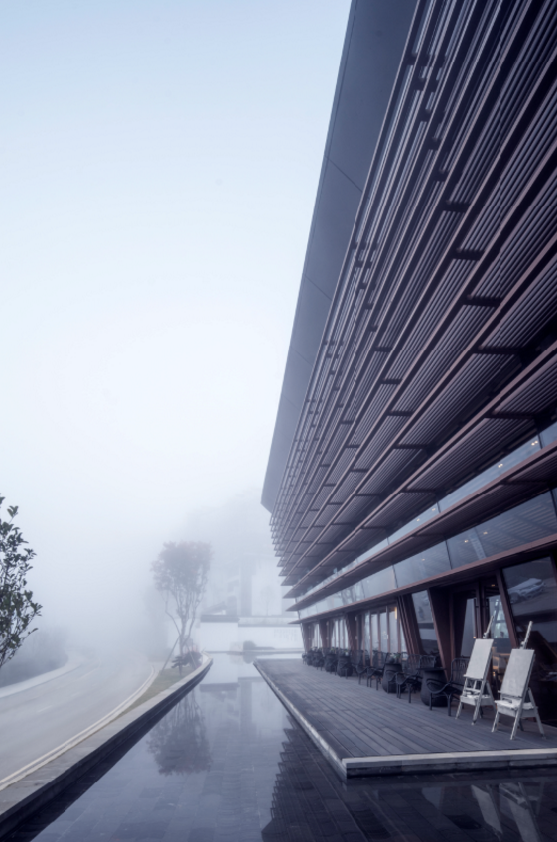 此外,南楼与近景狼牙山的平行相对,最大限度地将葱郁翠绿的山景引入建筑,北楼与南楼轻轻拉开,留出视廊将远处高黎贡山的磅礴美景纳入其间。建筑后院借鉴江南古典园林,游廊环抱,古木水榭,春水满塘,如诗如画。