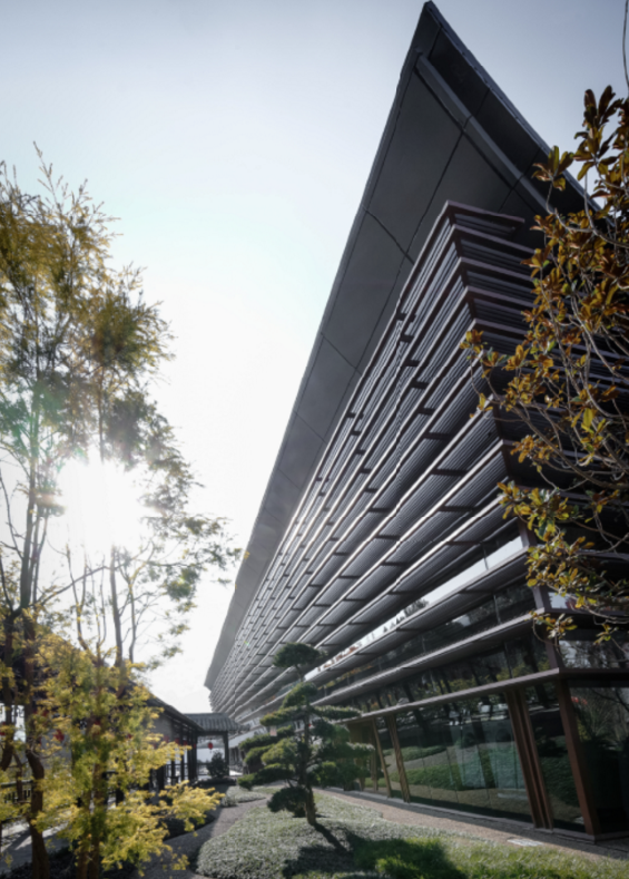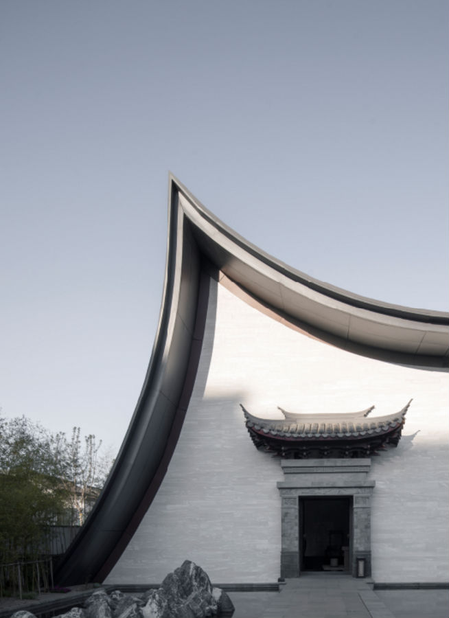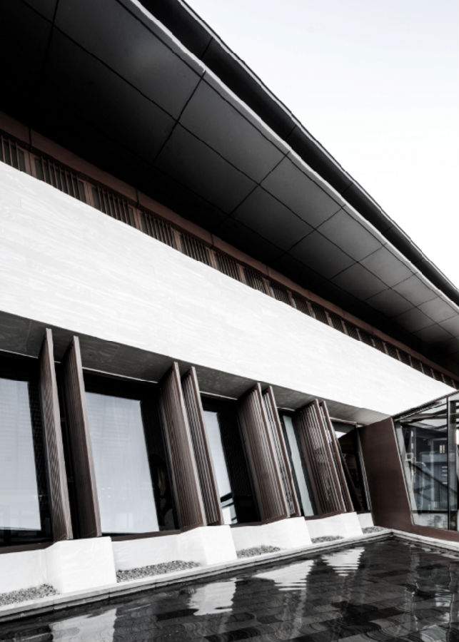 建筑由倚立的双楼组成,一虚一实,一阴一阳,相承相生。设计借鉴并创新演绎了中国传统建筑屋顶起翘飞檐的形式,南楼傲天,北楼接地,灵动柔美,轻盈飘逸。前庭设一池静水,将双楼、飞檐、幻天、山水倒映其中。The building consists of two towers standing on top of each other. The design borrows and innovates the form of the eaves and eaves on the roof of traditional Chinese architecture. The South Building points to the sky, and the North Building sticks to the ground. It is agile and soft,light and elegant. There is a pool of still water in the forecourt,which reflects the double buildings,cornices,sky,and landscape.