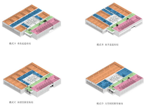 在形体变化上,设计采用“切—分—转—退”手法,既不打破现有空间尺度,又合理划分平面功能。在建筑平面上,遵循实验空间迭代策略,中间通高空间形成每三层一单元的共享空间体系,介于实验空间和办公空间之间,平面也有灵活布局的可能性。