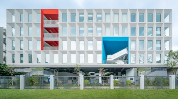 在面向城市的立面,设计采用装配式设计理念及施工技术,对装配式PC构件基本单元的斜面处理,表达教学雅致的空间,再通过灰空间、彩色洞口形成学校观看城市的窗口,为学生创造了多彩的活动空间,凸显自由开放的教育理念,同时也化解了格构带来的厚重感。
