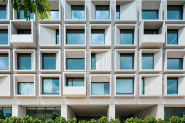 基于模数化柱网的前提,设计引入中国活字印刷理念,让立面模块化产生新的变化。4.2m*4.2m构件分成3个模组,结合斜面变化、混凝土单元与凸窗体系等精细化设计,在立面上随机拼出统一又有特色、暗藏细节变化的外立面表情。