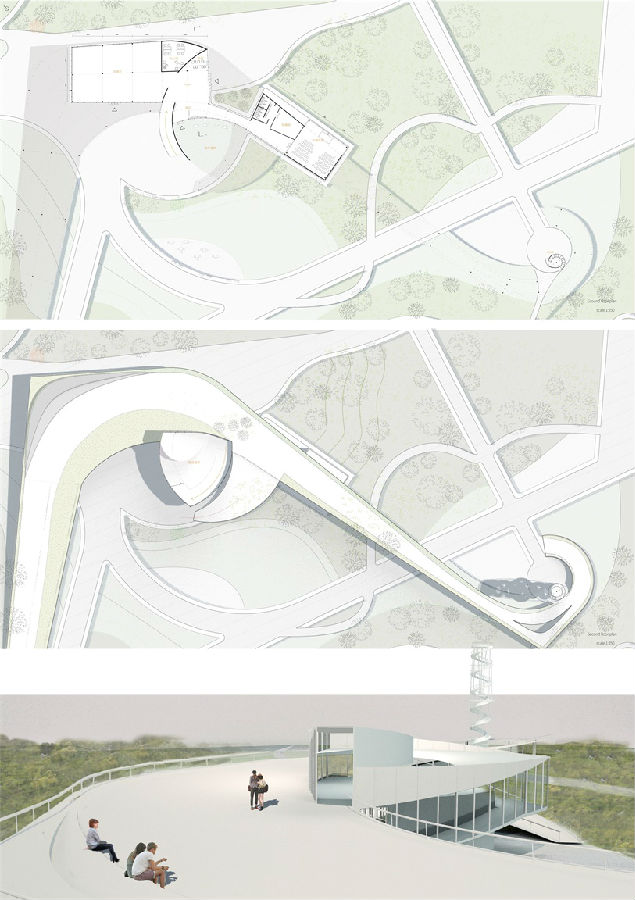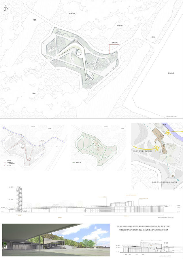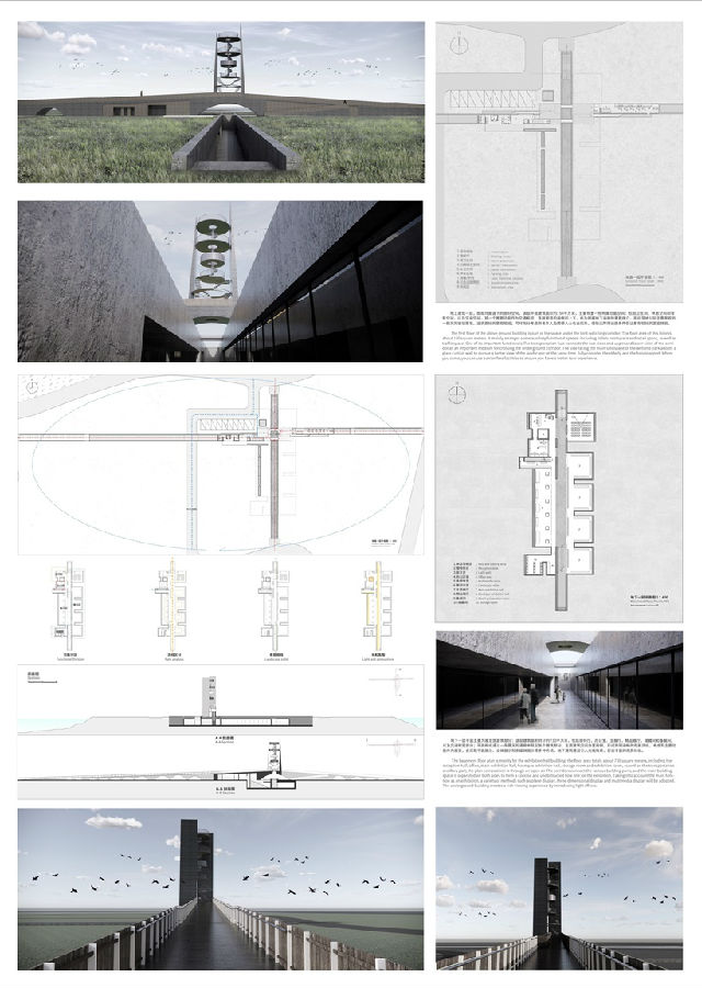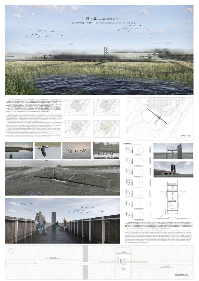 设计说明:设计概念有关归家与守望,地上的观光塔通过外部的竖向板、内部螺旋交会的梯形板传达着时间流逝与离去归来的生活规律,一字划过的大雁与两处河流相接,如同人流一般匆匆离去又归来,建筑与景观共同属于设计思想,也共同传达设计思想。