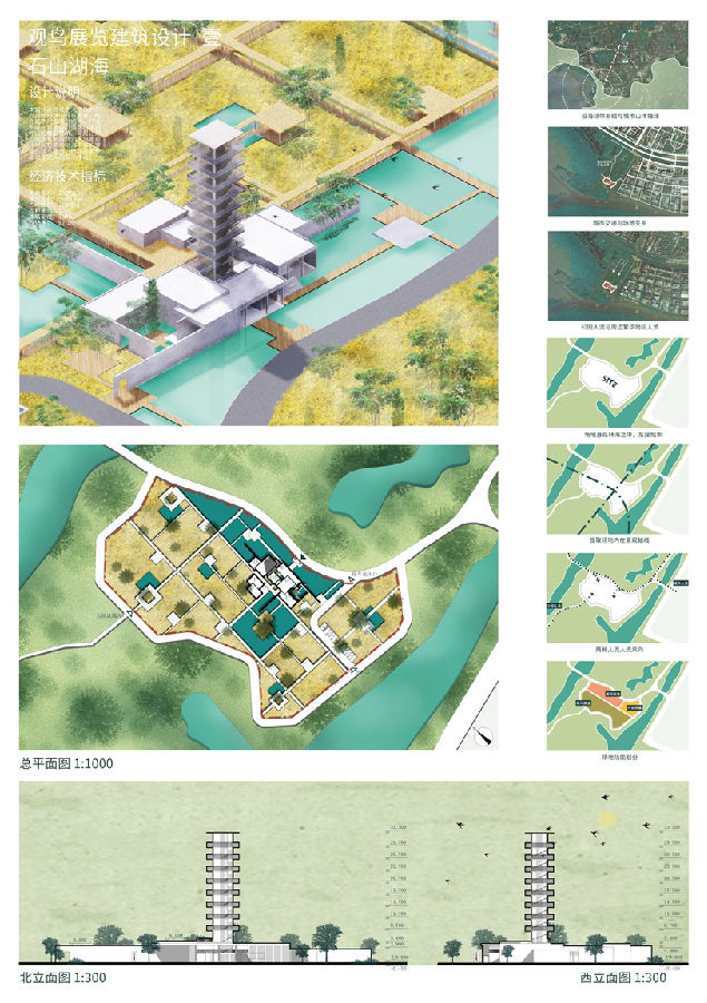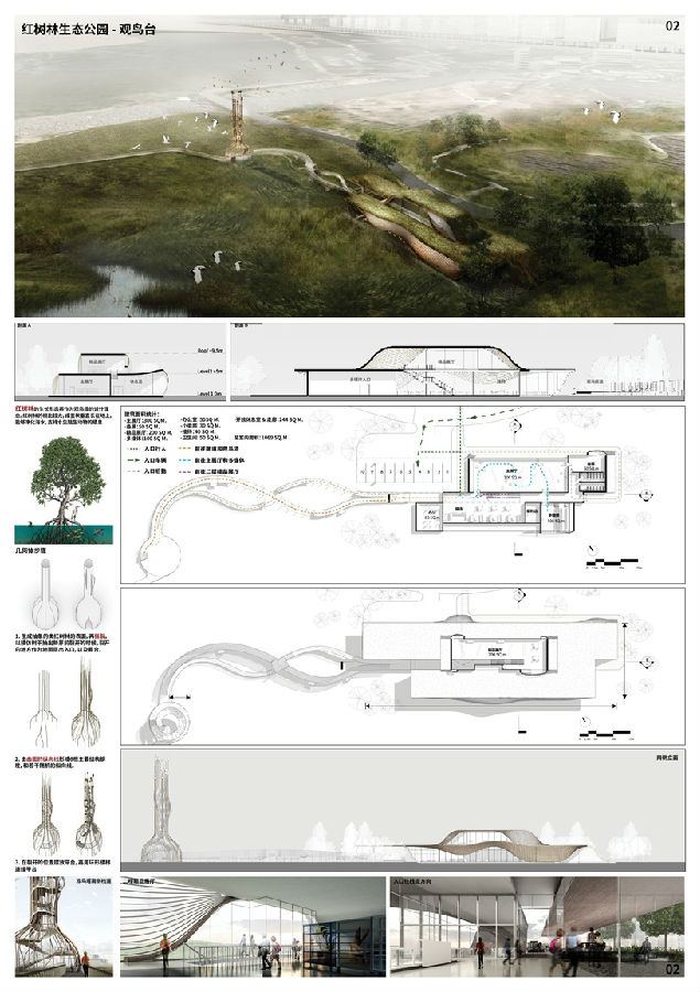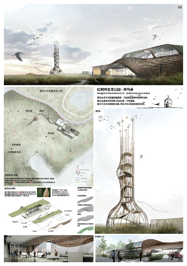设计说明:游人只是访客,鸟才是红树林的居民,规划尽可能减少人车流线,以减少建筑物对鸟类的影响;建筑设计灵感取自红树林,赋予观鸟塔自然形态,同时采用鸟巢的编织纹路,让展厅表皮与环境友好结合,打造与自然融为一体的观鸟建筑。