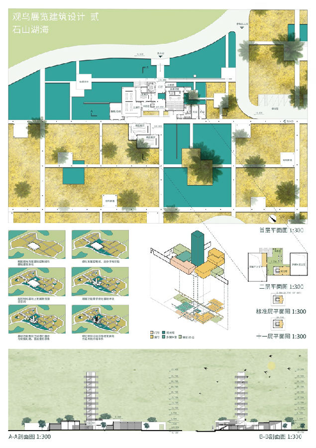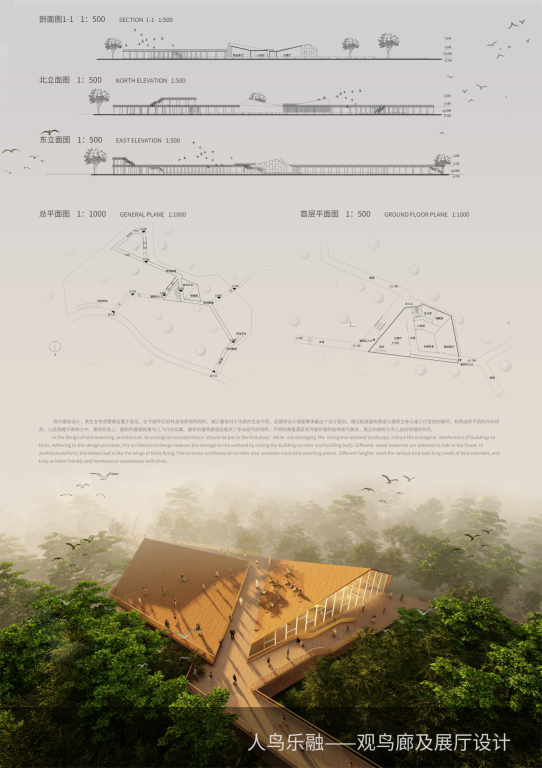 设计说明:观鸟建筑,生态是首要因素。设计通过抬高建筑主体以减少对湿地的破坏,而不同的木料材质将其隐于森林之中,与此同时,以曲 折的建筑廊道形态提供丰富的观鸟空间与视角,满足不同爱好者需求,真正做到人鸟乐融。