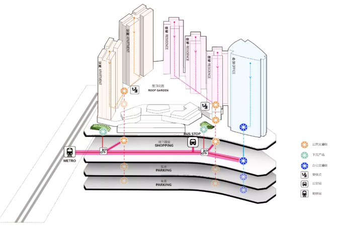 与此同时,南北交通核及办公核均向社会开放,成为住宅和公寓的形象入口,通过平面网络与竖向空间的整合,原本单纯以移动为目的的步行网络也兼具了休憩、逗留和聚集的功能,而从地铁方向来的办公人流也可以进一步带动商业活力。
