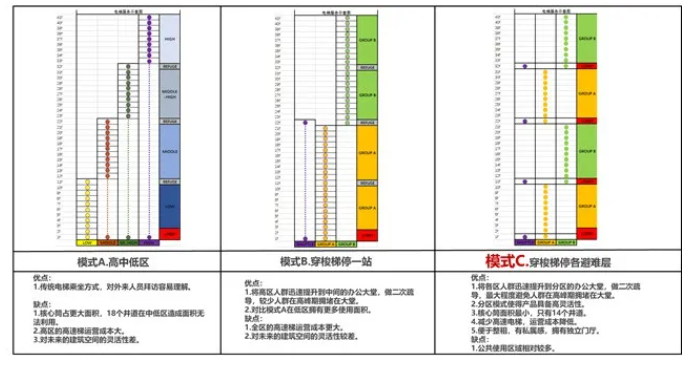 项目在立足三大功能的基础上,遵循设计的统一性,办公楼象征关口旗舰,电梯系统采用“高铁+地铁双系统”的模式,穿梭梯停留各避难层,可将人群快速提升,减少核心筒面积和高速电梯数量,提高使用率。同时,设计从方案之初就采用BIM设计,实现了从方案到施工图的全过程REVIT正向设计,也方便了后期的运营与维护。