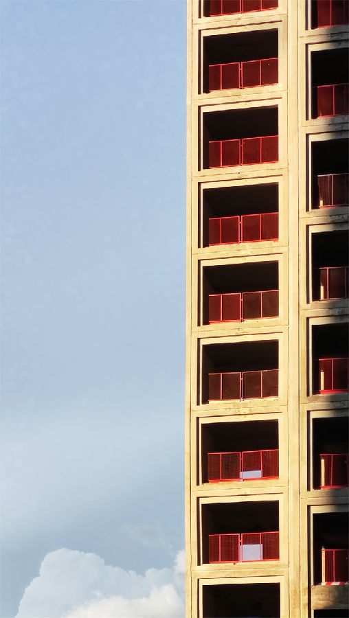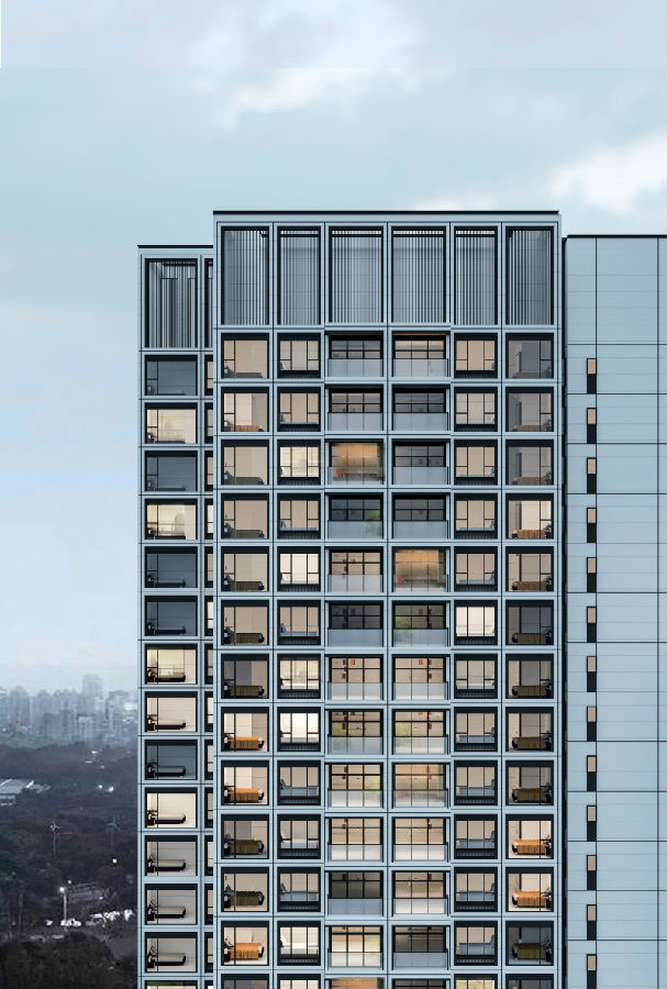 设计利用装配式的本身概念,通过窗户与墙面调节让内部开间错位,避免立面上空调、凸窗、阳台无序错落,消隐外立面多余线条,同时结合平面对户型的适当牺牲调整,营造规整简约美感。