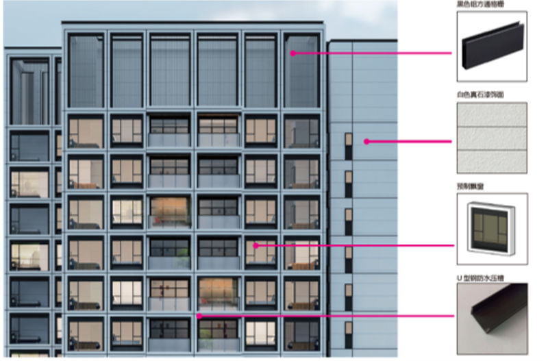 综合考虑项目美学效果与建造成本,项目设计的铝合金边框,收边较薄,面积较小,以每平方仅增加十几元的造价优势,让装配式美学得以落地呈现。