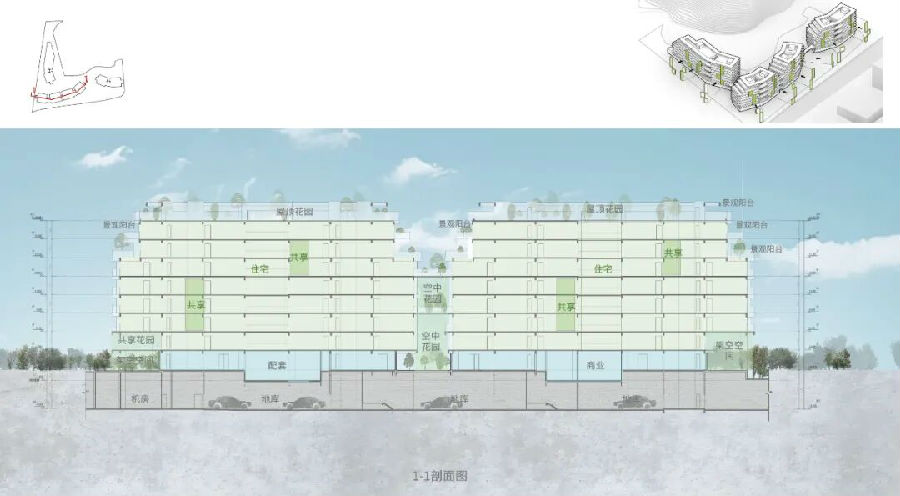 建筑不再以密度取胜,而以舒展回应自然。在高密度住宅成为常态的今天,项目以多层尺度塑造开放而生态的生活空间,通过平台悬挑与体块错动,创造丰富的立体绿化与自然通风体系。同时,结合遮阳立面、雨水回收与屋顶花园等被动节能策略,让建筑在节能与舒适间取得平衡,营造低碳、宜人的绿色社区。
