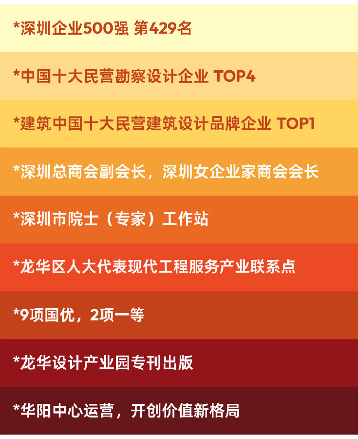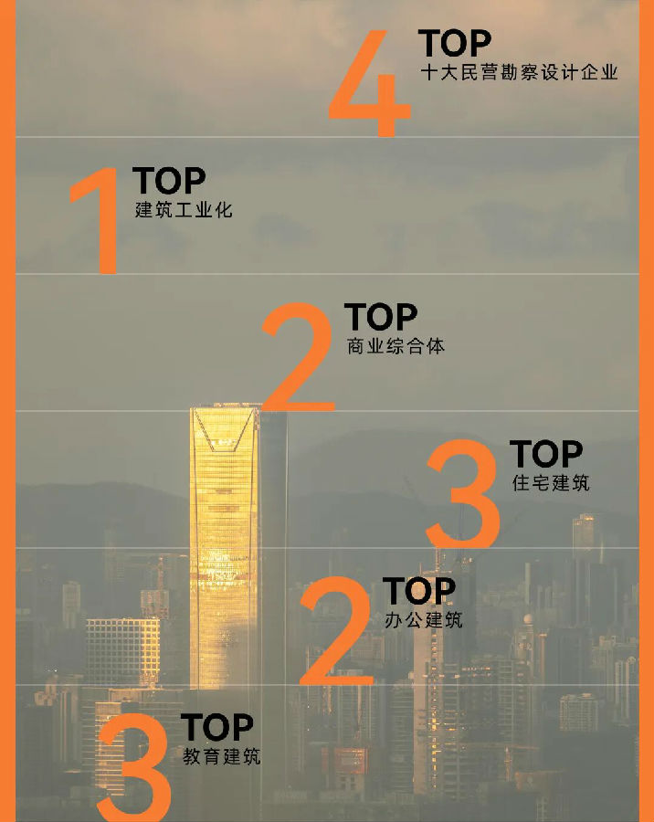 设计行业排名前沿 位列深圳企业500强第429名,连续7年上榜;位列中国十大民营勘察设计企业TOP4,其中建筑工业化TOP1,办公建筑TOP2,商业综合体TOP2,住宅建筑TOP3,教育建筑TOP3;位列建筑中国十大民营建筑设计品牌企业TOP1。