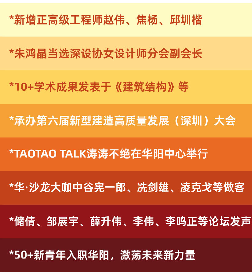 承办行业活动 华阳国际作为会长单位承办“第六届新型建造高质量发展(深圳)大会”;联合主办“第十九届思翔院长论坛·年会”院长圆桌会;TAOTAO TALK涛涛不绝系列分享会在华阳中心举行。